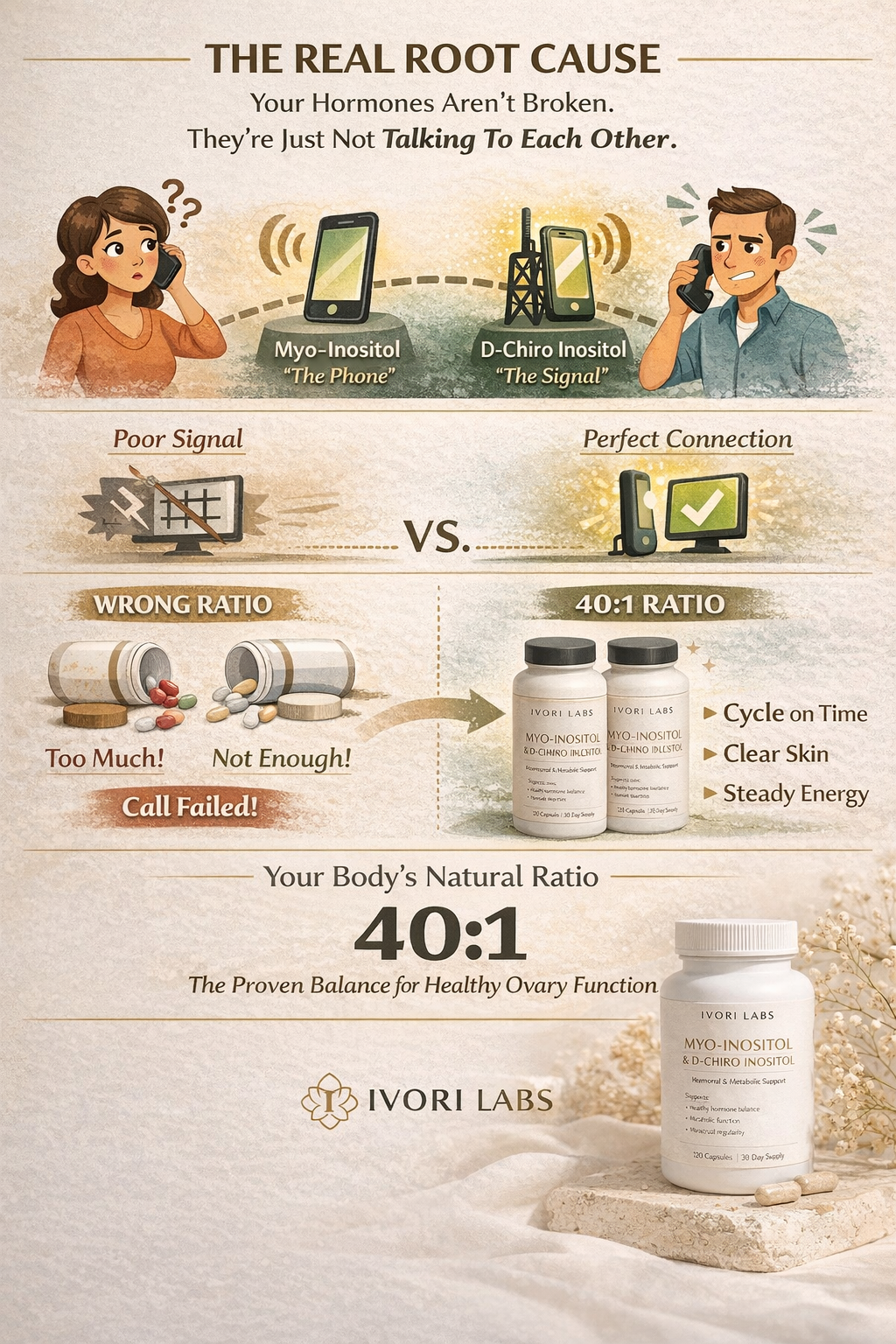 That's why we created Ivori Labs — the first pharmaceutical-grade, 40:1 Myo:D-Chiro Inositol supplement built specifically for the sophisticated PCOS community. Women who have read the Reddit threads. Women who have tried Ovasitol and Wholesome Story. Women who understand the mechanism but haven't found a product that delivers on it properly.